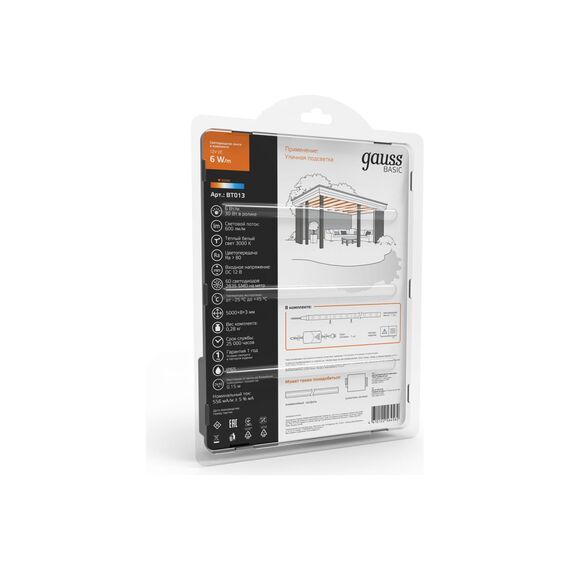 Лента Gauss Basic в комплекте 12V 6W/m 600lm/m 3000K IP65 LED 5m BT013 способна решить ряд задач связанных как с декоративным освещением помещений, так и с экстерьерной подсветкой.