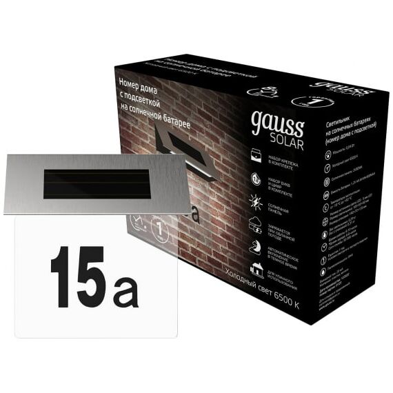 Светильник на солнечных батареях Gauss серии Solar предназначен для подсветки указания номера дома. Номер дома с подсветкой Gauss работает от солнечной батареи, использующей энергию солнца для зарядки встроенного аккумулятора, поэтому является экологически чистым и экономит электроэнергию. Номер дома с подсветкой не требует подключения к сети, что позволяет устанавливать его в любых, даже труднодоступных местах. Номер дома с подсветкой на солнечной батарее можно использовать круглый год, потому что он заряжается даже при облачной погоде и устойчив к изменению погоды и температуры.