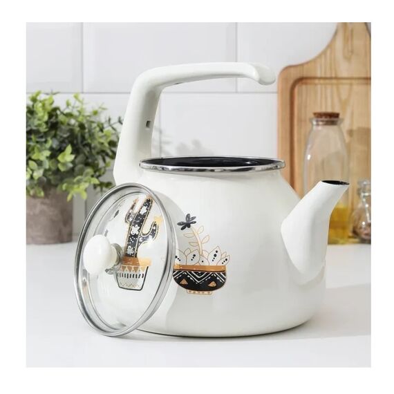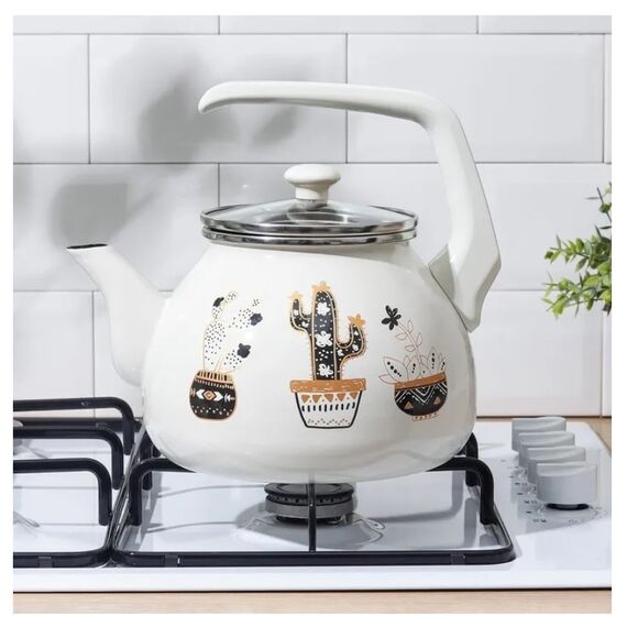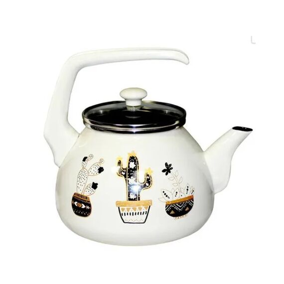 Эмалированный чайник INTEROS Кактусы белые изготовлен из высококачественной стали и покрыт плотной двухслойной стеклокерамической эмалью с содержанием фарфора.