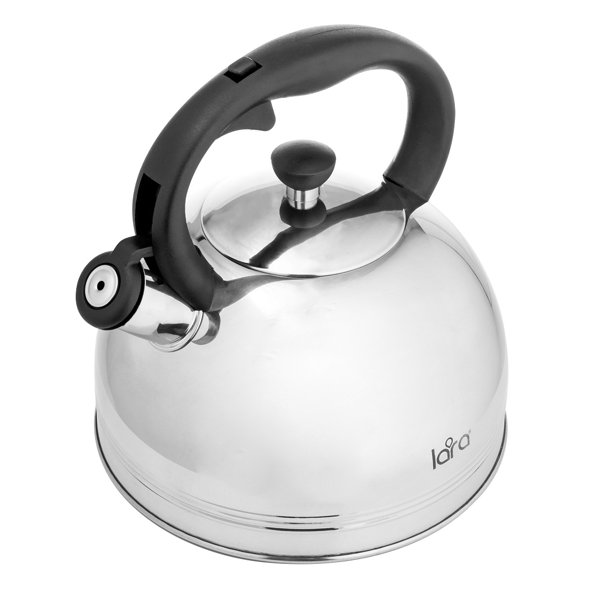 Чайник со свистком LARA в классическом корпусе украшен продольными ребрами у основания. Такой чайник хорошо впишется в интерьер вашей кухни. Он без проблем вскипятит необходимое количество воды, а свисток не позволит пропустить момент закипания. Большой объем и удобная широкая горловина для залива воды. Чайник изготовлен из экологичной высококачественной нержавеющей стали с зеркальной внешней и матовой внутренней полировкой. Эргономичная рукоятка выполнена из ненагревающегося нейлона черного цвета. Установлен свисток с безопасным кнопочным механизмом. Толстое индукционное капсулированное дно подходит для всех типов плит.