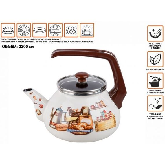 Чайник стальной эмалированный 2,2 л PERFECTO LINEA Традиции (52-951922) изготовлен из 5-тислоев: внутренний покровный слой эмали; внутренний грунтовый слой эмали; стальная основа; наружный грунтовый слой эмали; наружный покровный слой эмали. Эмалированная стальная посуда ТМ Perfecto linea не вступает в реакцию с едой, гипоаллергенна, безопасна, гигиенична и легко моется, можно мыть в посудомоечной машине, устойчива к царапинам и пожелтению, подходит ко всем типам плит.