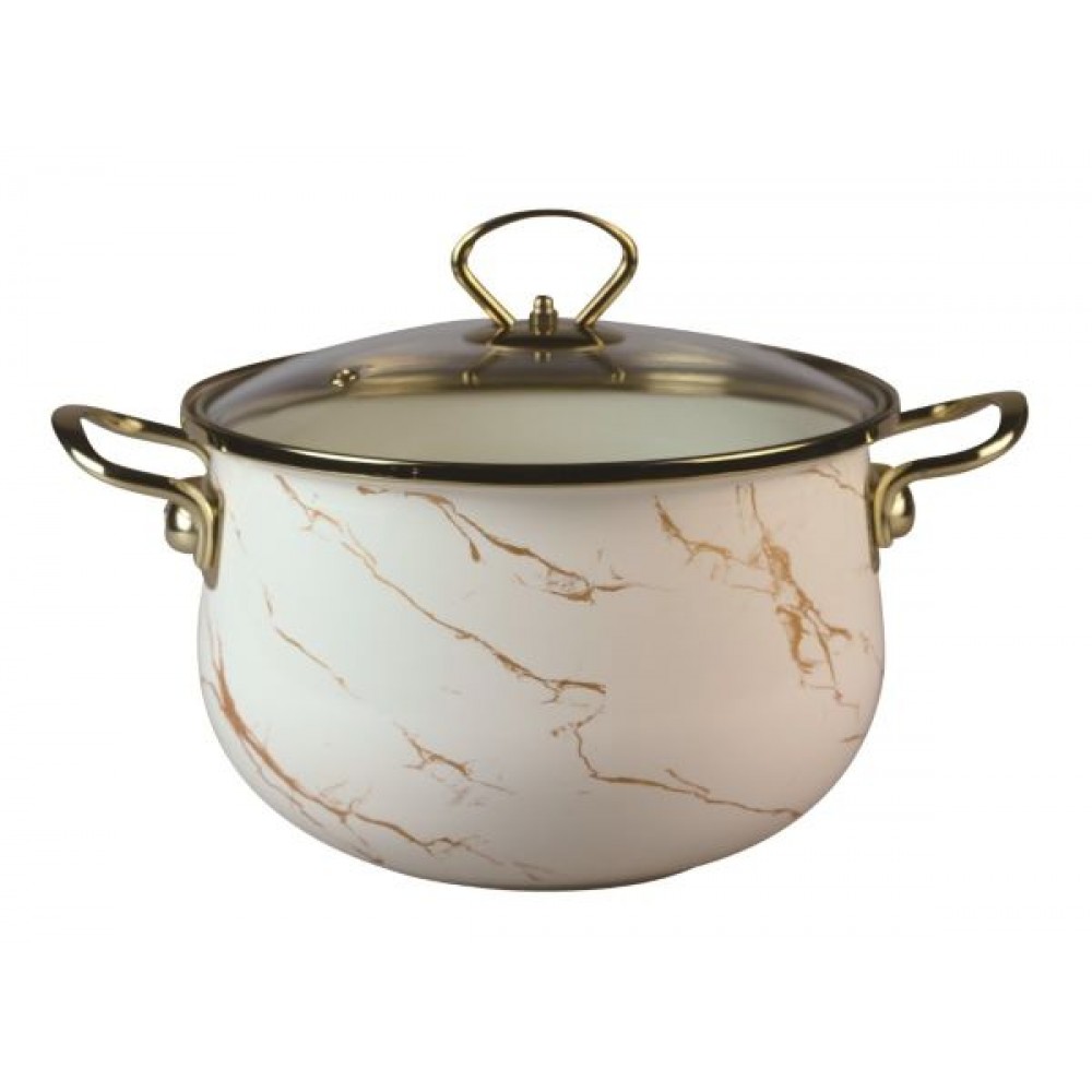 Кастрюля 6,5 л эмалированная со стекл. кр., ручка золото; цвет: кремовый мрамор