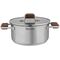 Технология: тройное штампованное, а затем вплавленное дно без воздушных полостей. Оригинальная конструкция ручек - комбинация стали и бакелита. Преимущества: эргономичная форма ручек Плоская крышка из термостойкого стекла с паровыпуском и широким металлическим ободом.