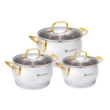 Кастрюли 2,0л (169,5см), 3,0л (1811,5см), сотейник 1,2л (14*8,5 см), нержавеющая сталь 18/10, крышка из жаропрочного стекла с отверстием для выхода пара, 5-ти слойное капсулированное теплоаккумулирующее индукционное дно 5см, толщина стенок 0,5 мм, шкала уровня воды. Тип продукта: набор посуды...