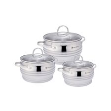 Тип: набор 3 шт. Материал: нержавеющая сталь Источник нагрева: все плиты, включая индукцию Комплектация: - Кастрюля с крышкой 1,9л (16 см) - Кастрюля с крышкой 2,6л (18 см) - Кастрюля с крышкой 3,6л (20 см)