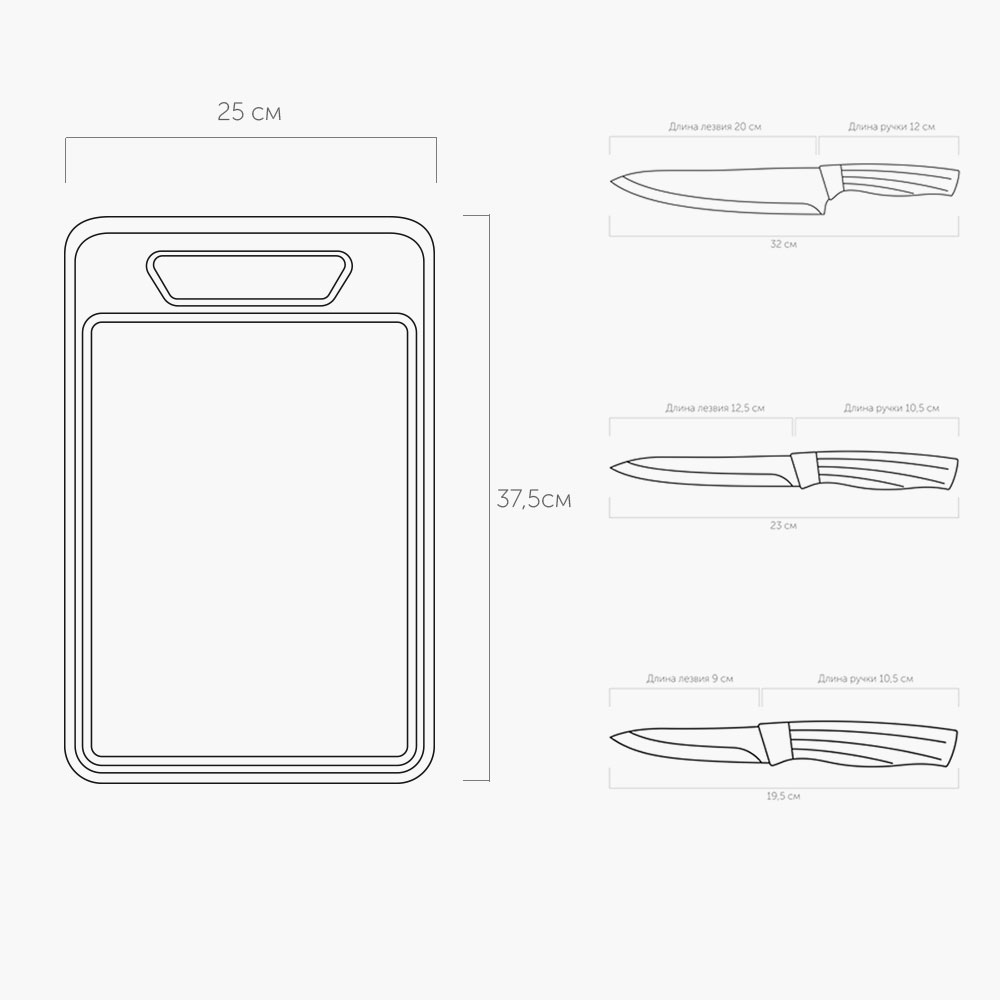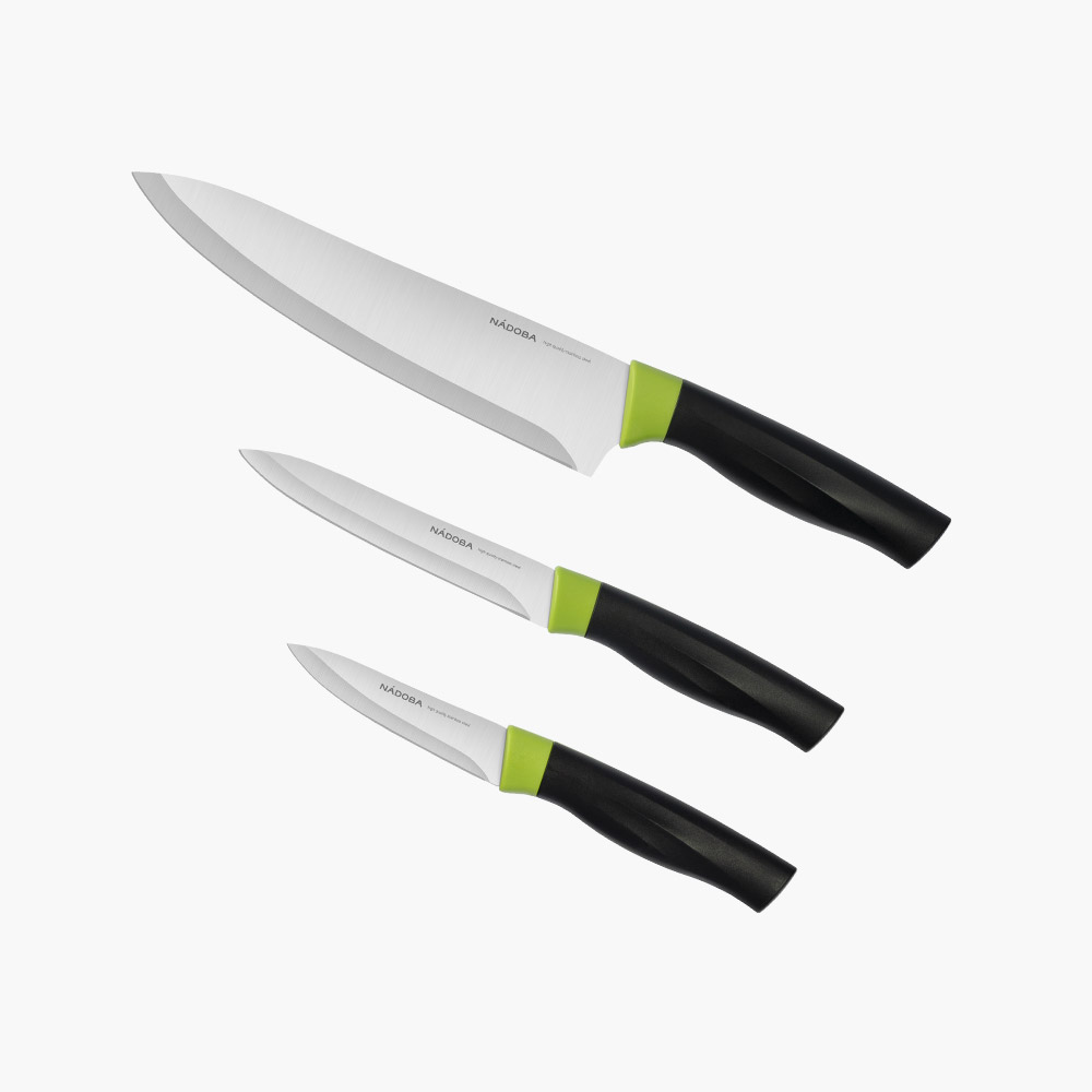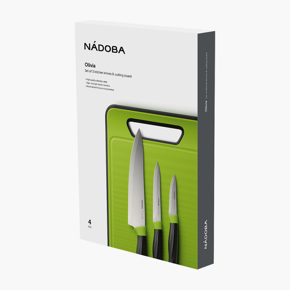 Набор из 3 ножей с доской NADOBA серии Olivia состоит из: нож овощной, 9 см, нож универсальный, 12,5 см, нож поварской, 20 см и разделочной доски.