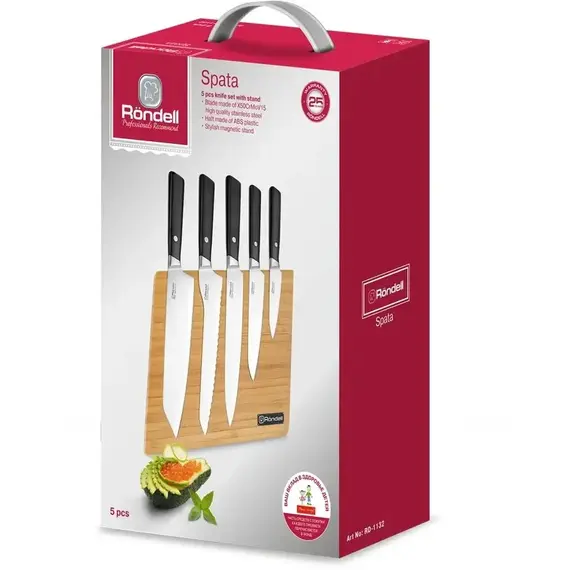 Особенность набора ножей Spata заключается в наличии особой подставки, на которой и фиксируются все атрибуты при помощи скрытого магнита. Рукоятка из ABS-пластика устойчива к преждевременному появлению повреждений. Очищать аксессуары от накопившихся загрязнений рекомендовано вручную.