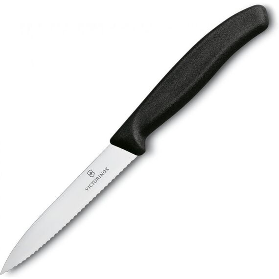 Острый и удобный кухонный нож с серрейторной заточкой для измельчения, очистки фруктов и овощей, а также нарезки помидоров и сосисок Victorinox. Рукоять изготовлена из оранжевого матового полипропилена. Клинок выполнен из высококачественной нержавеющей стали