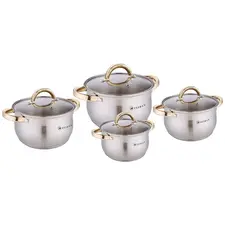 Описание Набор посуды, 8 предметов; В набор входит: 4 кастрюли с крышками; Объём кастрюль: 2,0л/2,7л/3,6л/6,1л; Диаметр кастрюль: 16см/18см/20см/24см; Материал: нержавеющая сталь; Жаропрочные стеклянные крышки с паровыпуском; 3-x слойное капсулированное индукционное дно; Ручки...