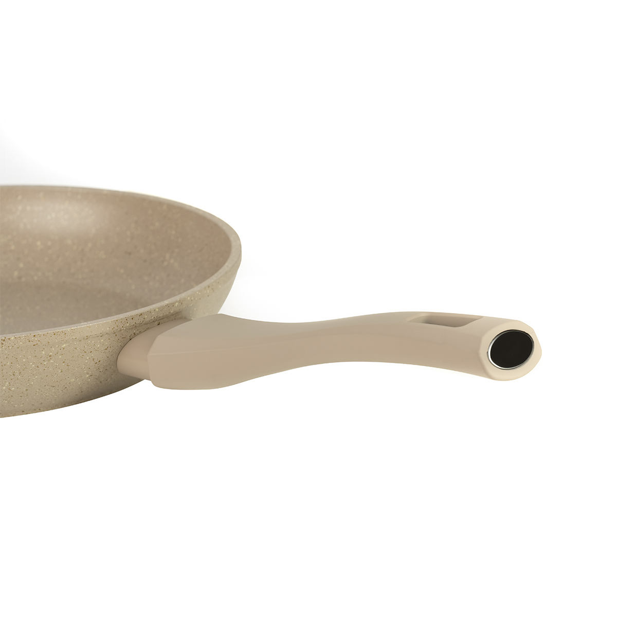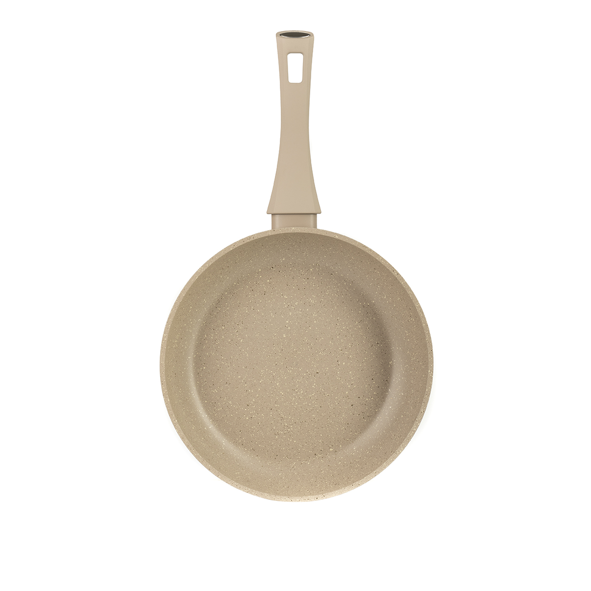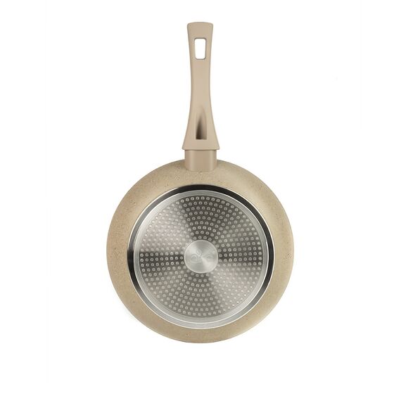 При изготовлении были использованы экологически чистые материалы. Корпус выполнен из кованого алюминия с отличными теплопроводными свойствами. Эргономичная ручка с широким хватом выполнена из бакелита и имеет приятное покрытие Soft-Touch бежевого цвета. Стальное точечное индукционное дно подходит ко всем типам плит. Удобная петля для подвешивания.