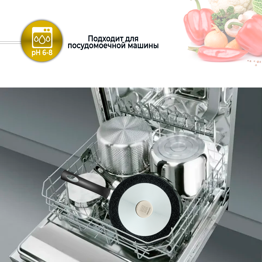 • Рекомендуем мыть сковороду с антипригарным покрытием вручную. Для мытья в посудомоечной машине используйте щадящие средства с pH 6-8, в противном случае на участках без покрытия (проточенное дно, место крепления ручки) может образоваться серый налет.