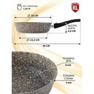 Сковороды ТМ RASHEL выполнены из высококачественного пищевого алюминия. Внутреннее и внешнее сверхпрочное, гранитное, антипригарное покрытие ТИТАН&ГРАНИТ.