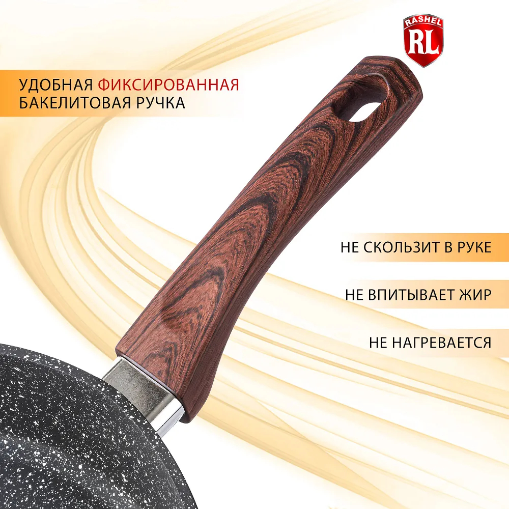 Сковороды ТМ RASHEL выполнены из высококачественного пищевого алюминия. Внутреннее и внешнее сверхпрочное, гранитное, антипригарное покрытие ТИТАН&ГРАНИТ.