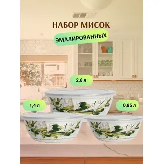 Набор мисок ZEIDAN , 6 предметов, (3 МИСКИ С КРЫШКАМИ 1) 0,85 л. высота 6 см. диаметр 16 см), 2) 1,4 л, высота 7,5 см. диаметр 18 см), 3) 2,6 л. высота 8,5 см. диаметр 20 см) с внутренним эмалированным покрытием), эмалированная сталь, внешнее покрытие - эмаль с рисунком. Подарочная упаковка.