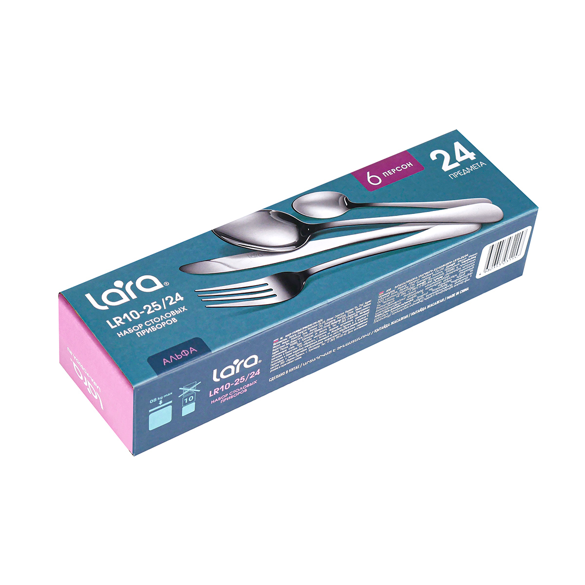 Столовые приборы LARA LR10-25/24 Альфа – это превосходный набор высокого качества, включающий 24 предмета на 6 персон. Каждый предмет идеально сбалансирован, ручки имеют специальную форму и отлично лежат в руке. Комплект изготовлен из пищевой нержавеющей стали, не имеет запаха и сохраняет вкус и аромат продуктов. Все изделия высокого качества и очень прочные, не гнутся, имеют длительный срок службы, отлично сохраняют эксплуатационные свойства. Столовые приборы Lara подходят как для ежедневного использования, так и для сервировки праздничного стола. Можно мыть в посудомоечной машине.