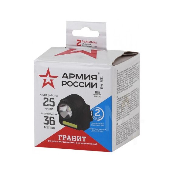 GA-501 Фонари Армия России АРМИЯ РОССИИ налобный Гранит [3Вт COB + 3Вт LED, ближ и дальн свет, аккум, карт]
