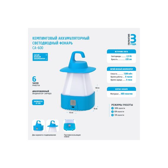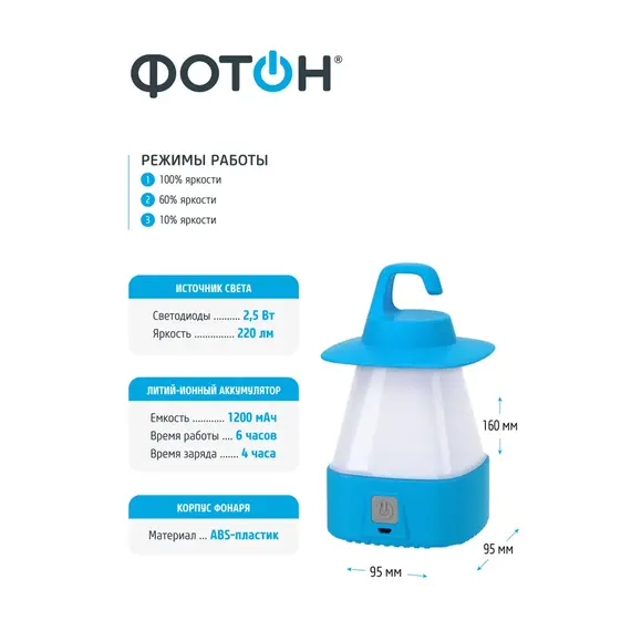 Кемпинговые фонари «ФОТОН» создадут приятную, уютную атмосферу во время похода или путешествия. Самые удобные фонари – те, которые можно и поставить на стол, и подвесить под потолок тента или палатки. Мощный рассеянный свет благодаря современным светодиодам. Два варианта подвешивания за счет съемной конструкции крышки. 2 режима яркости (30% и 100%). Источники света – 20 светодиодов мощностью 2,5 Вт.
