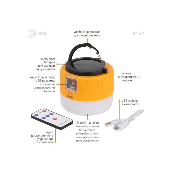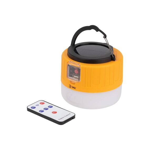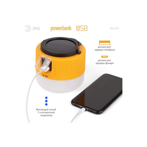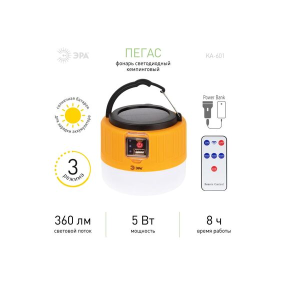 Аккумуляторный светодиодный кемпинговый фонарь ЭРА KA-601 Пегас на солнечной батарее пульт Б0054043 – инновационный кемпинговый фонарь со встроенной солнечной батареей и пультом дистанционного управления. Аккумуляторный фонарь ЭРА «Пегас» также заряжается от USB (кабель в комплекте). От одной зарядки непрерывно проработает 8 часов. Может использоваться в качестве powerbank – в условиях похода выручит, если нужно подзарядить телефон или другой мобильный гаджет. Мигающий 3-сегментный индикатор покажет уровень заряда аккумулятора. Разъёмы для зарядки фонаря и телефона, а также кнопка включения и управления режимами освещения, спрятаны в специальном отсеке под прозрачной пластиковой крышкой.