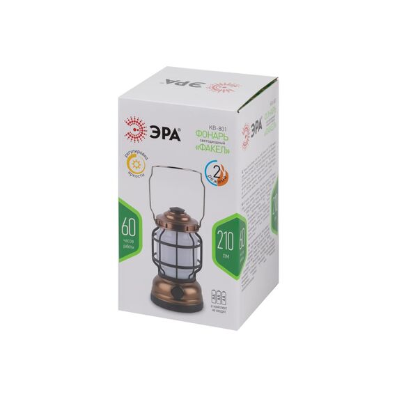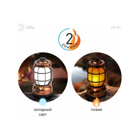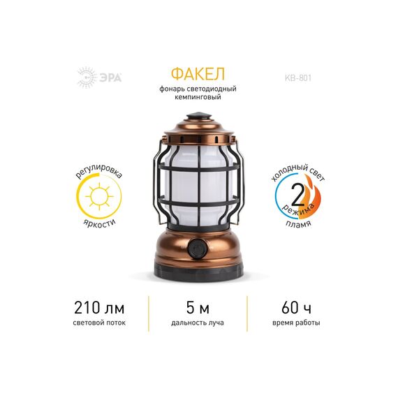 Светодиодный кемпинговый фонарь ЭРА KB-801 Факел на батарейках 2 режима холодный+пламя Б0054042 - кемпинговый фонарь в ретро-стиле. Светит в 2 режимах – холодный белый свет и режим теплого пламени. Работает от 3 пальчиковых батареек (3 х АА). Одного комплекта алкалиновых элементов питания хватает на 60 часов непрерывного свечения.