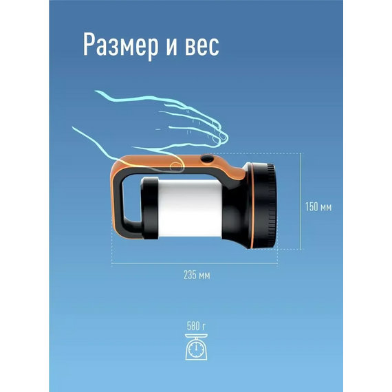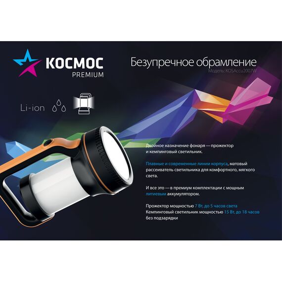 Ручной фонарь Космос KOSAccu2007W 2-в-1 со встроенным светильником на 360 градусов. Матовый рассеиватель дает мягкий, рассеянный свет, приятный для глаз. Совмещает луч фонаря (светит как фара автомобиля, направленный свет с ярким пятном засветки в центре) и свет кемпинговой лампы (освещает пространство вокруг себя). Длина луча – 400 м, время беспрерывной работы – до 5 ч в режиме основного света, до 18 в режиме эконом. Площадь освещения светильника - 42 кв.м, время беспрерывной работы – до 4 ч. 3 режима работы – яркий и экономичный для луча и режим кемпинговой лампы. Современный литиевый аккумулятор 3,7В 4800 мАч, подзарядка от USB. Упакован в коробку с подробной информацией о модели и схемой фонаря.