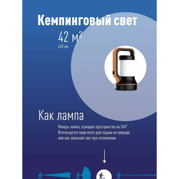 Двойное назначение фонаря — прожектор и кемпинговый светильник с литиевым аккумулятором.