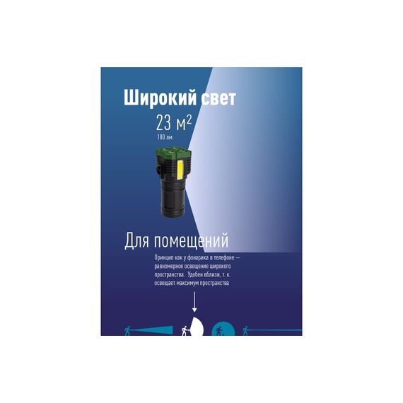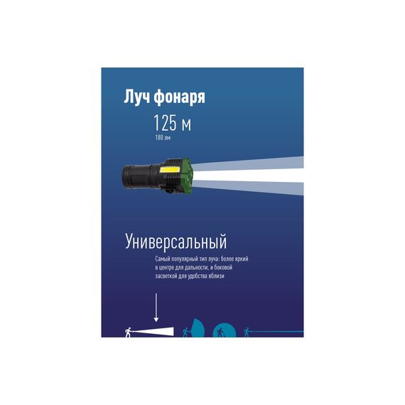 -Дистанция освещения: 125 м. (луч)/23 м2 (широкий свет, боковой светильник).