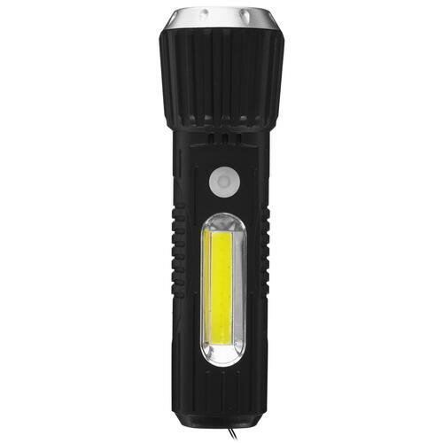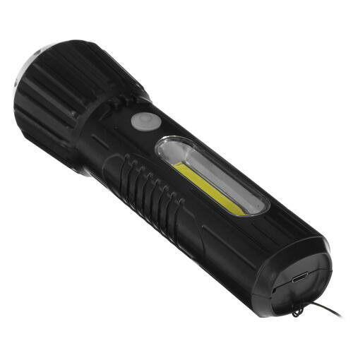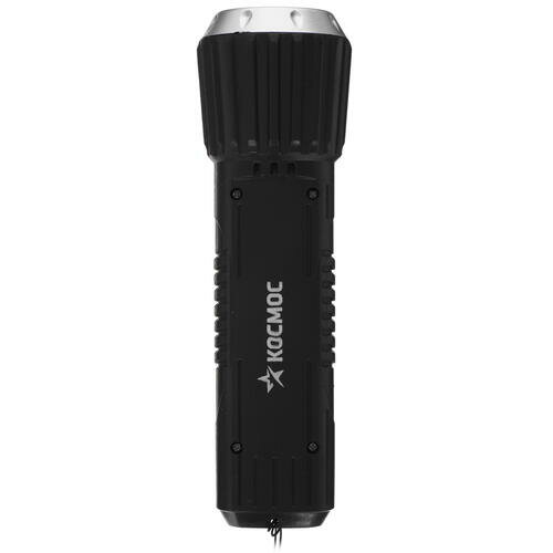 Ручной аккумуляторный фонарь КОСМОС 1Вт LED+2Вт COB, коллиматорная линза, Li-ion 18650 1000mAh, ABS-пластик, USB шнур KOS114Lit с защитой от дождя. Совмещает луч фонаря (направленный свет) и широкий свет (освещает широкое пространство с одной стороны). Источник питания: Li-ion аккумулятор 18650 3,7В 1000 мА/ч (встроенный).