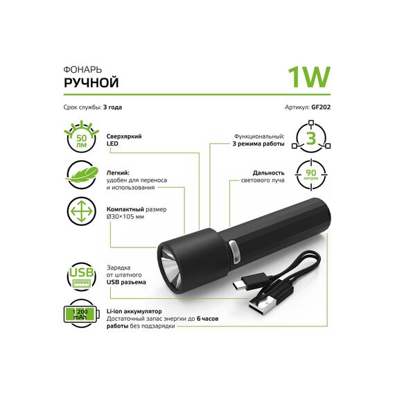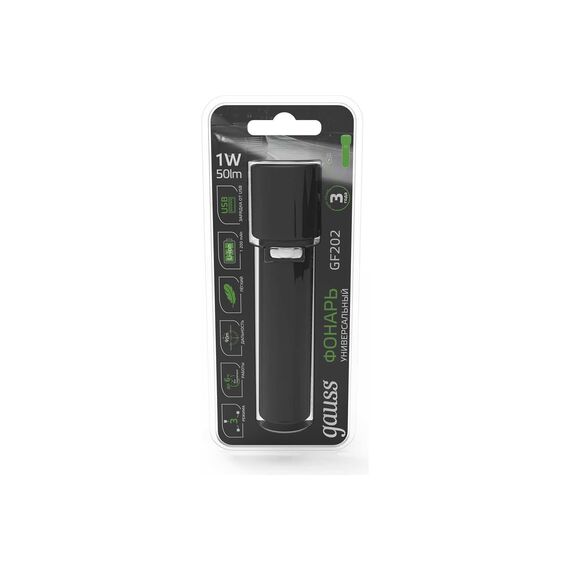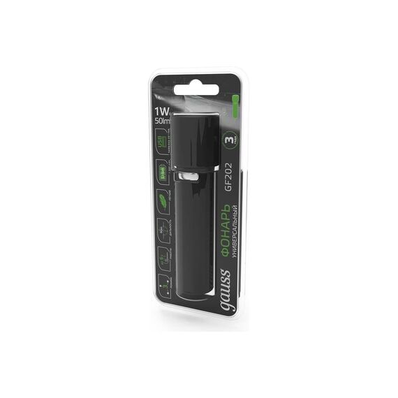 Ручной фонарь GAUSS модель GFL202 1W 50lm Li-ion 1200mAh LED предназначен для использования в качестве автономного портативного источника света. Фонарь работает от аккумулятора.