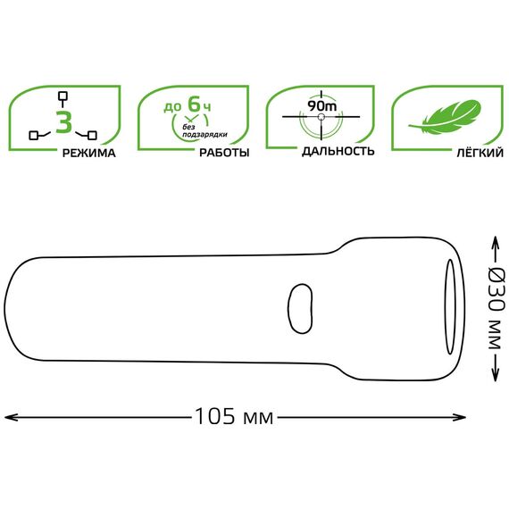 3 режима работы фонаря: - включение максимальной мощности, - включение приглушенного света, - включение режима - SOS.