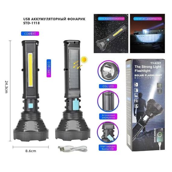 Фонарь ручной LEDPOWER STD-1118 аккумулятор+зарядка Micro+солнечная зарядка