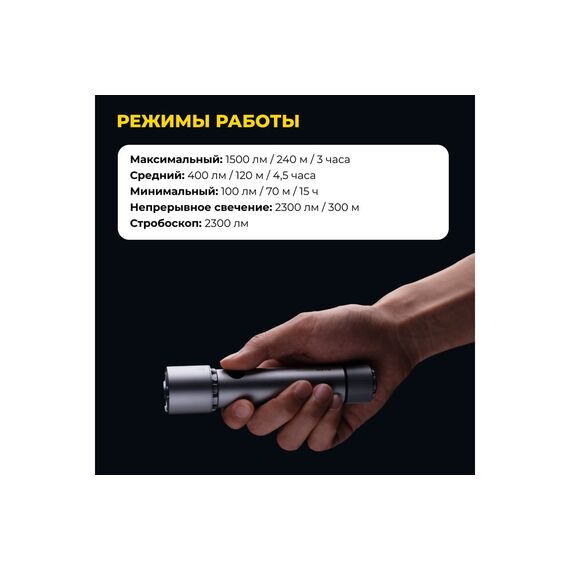 Быстрый интервал срабатывания кнопки 0,2 секунды экономит заряд фонаря, а также быстро реагирует на ваши действия.