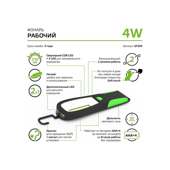 Рабочий фонарь GAUSS модель GFL504 4W 210lm 4xAAA LED1/12/48 GF504 - это подходящие решение, которое поможет подсветить даже труднодоступное пространство во время ремонтных работ дома, на даче, мастерской. Используется современный li-ion аккумулятор, способный поддерживать длительное автономное освещение и проводить его зарядку от штатного USB разъема в автомобиле или ноутбука. Прочная конструкция и мощный световой поток позволит с уверенностью решить любые задачи по освещению и обеспечит длительную службу.