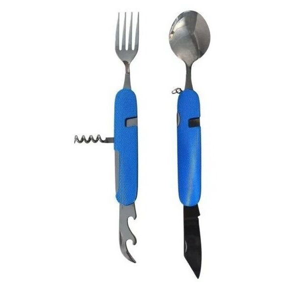 включает в себя ложку, вилку, нож, штопор, открывашку и шило, которые удобно и компактно