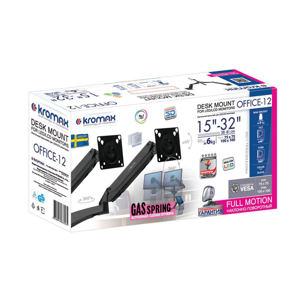 Кронштейн для мониторов ЖК Kromax OFFICE-12 черный 15"-32" макс.12кг настольный поворот и наклон
