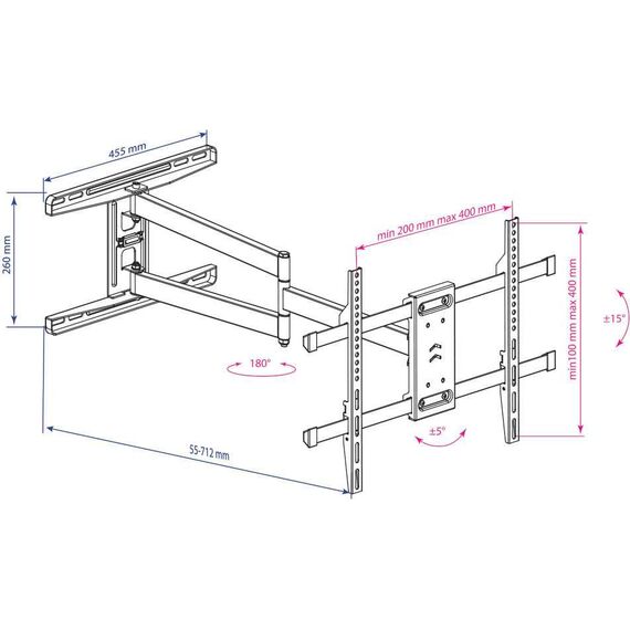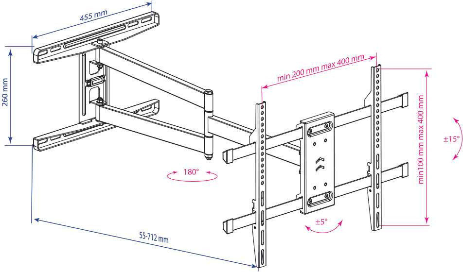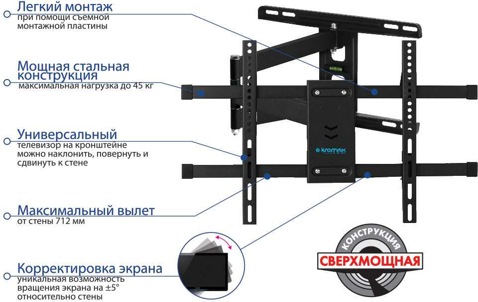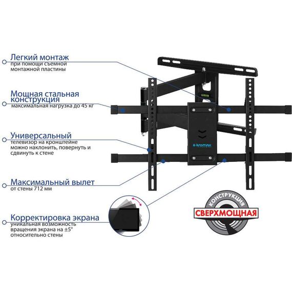 Описание: Легкий монтаж при помощи съемной монтажной пластины. Мощная стальная конструкция. Универсальный телевизор на кронштейне можно наклонить, повернуть и сдвинуть к стене. Максимальный вылет от стены 712 мм. Корректировка экрана уникальная возможность вращения экрана на ±5° относительно стены.