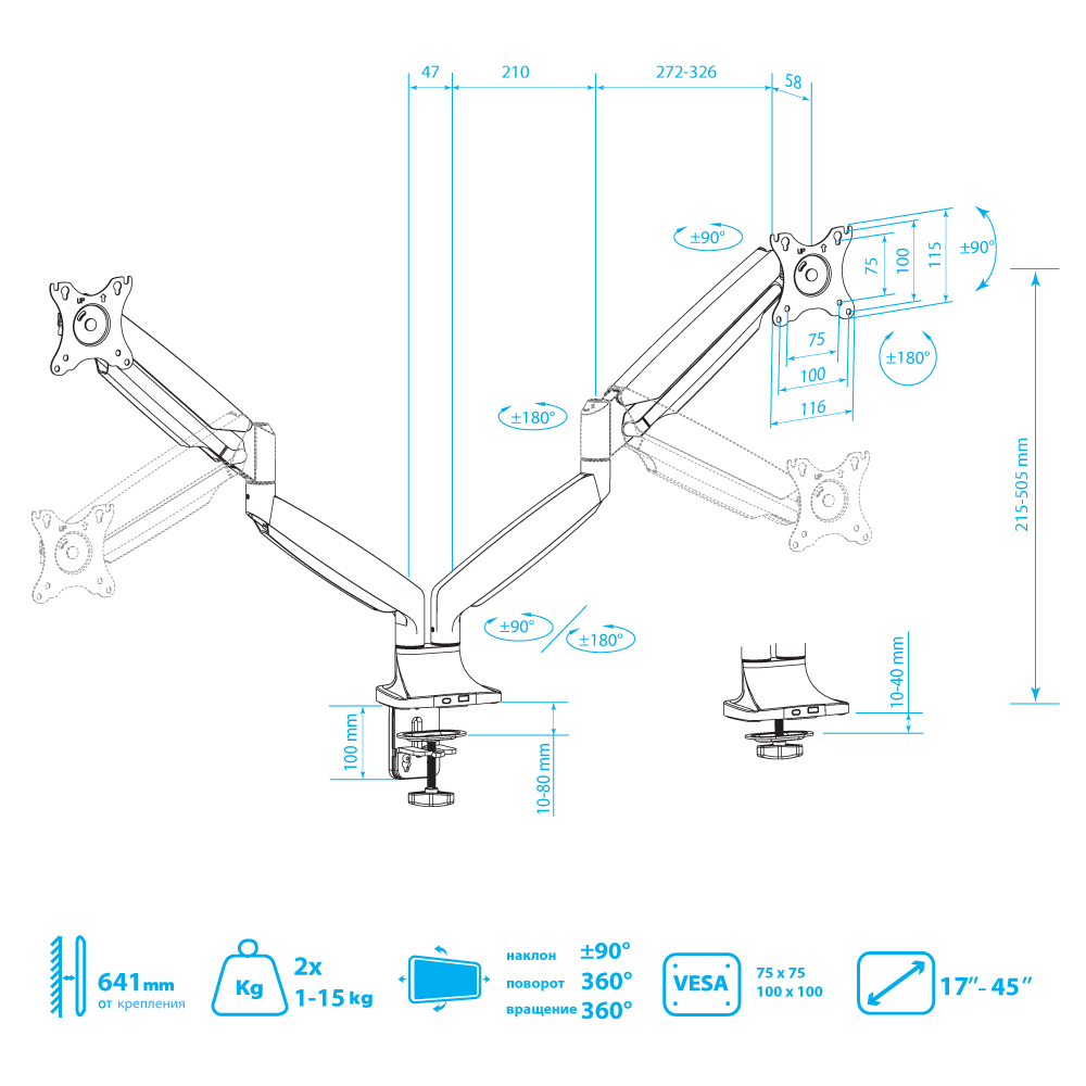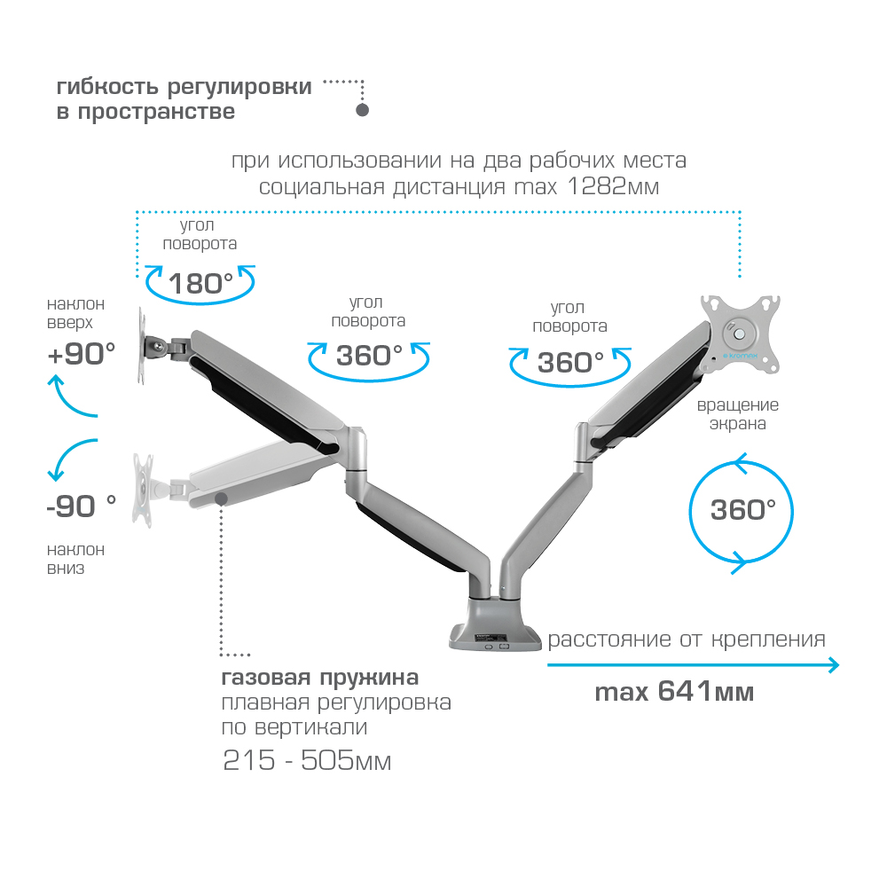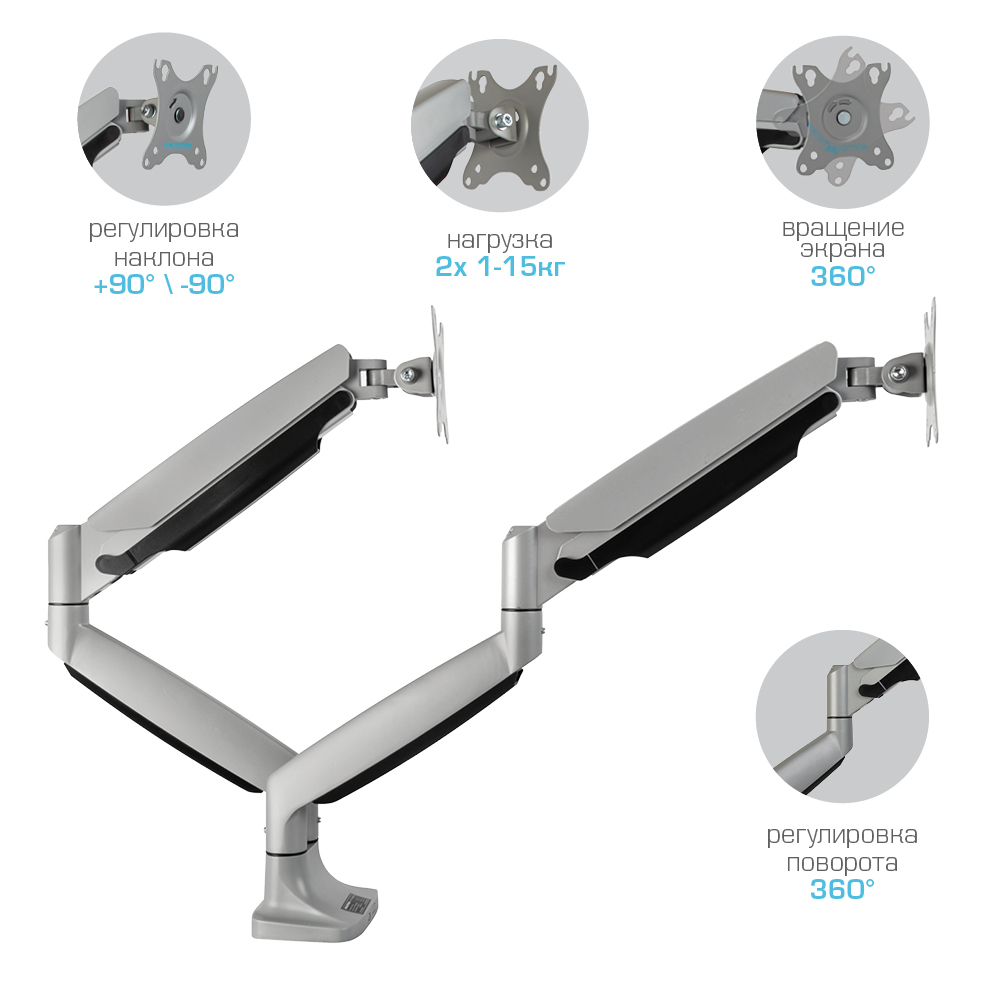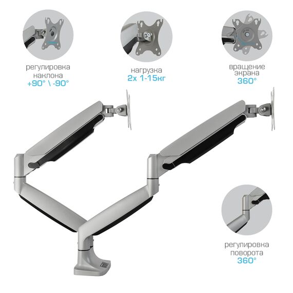 Система легкой регулировки 3D Motion System специальный сферический шарнир позволяет легко и точно регулировать положение мониторов, Вращения экрана на 360° возможность размещения мониторов, как в вертикальном, так и в горизонтальном положении, Вертикальное перемещение в пределах 270 mm, Газовая пружина GAS SPRING Обеспечивает плавное движение монитора вверх и вниз, а так же делает возможность фиксировать монитор в любом промежуточном положении, Два способа крепления к столу