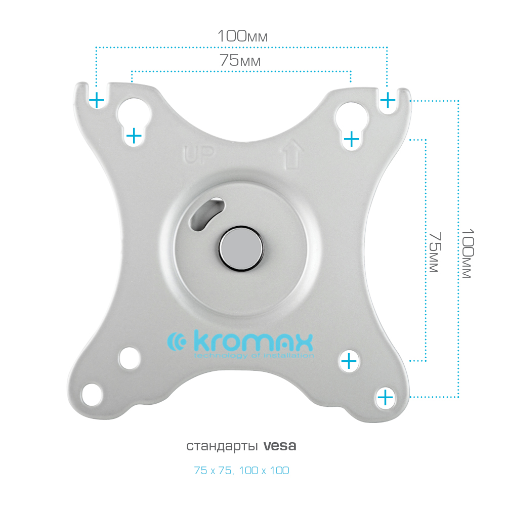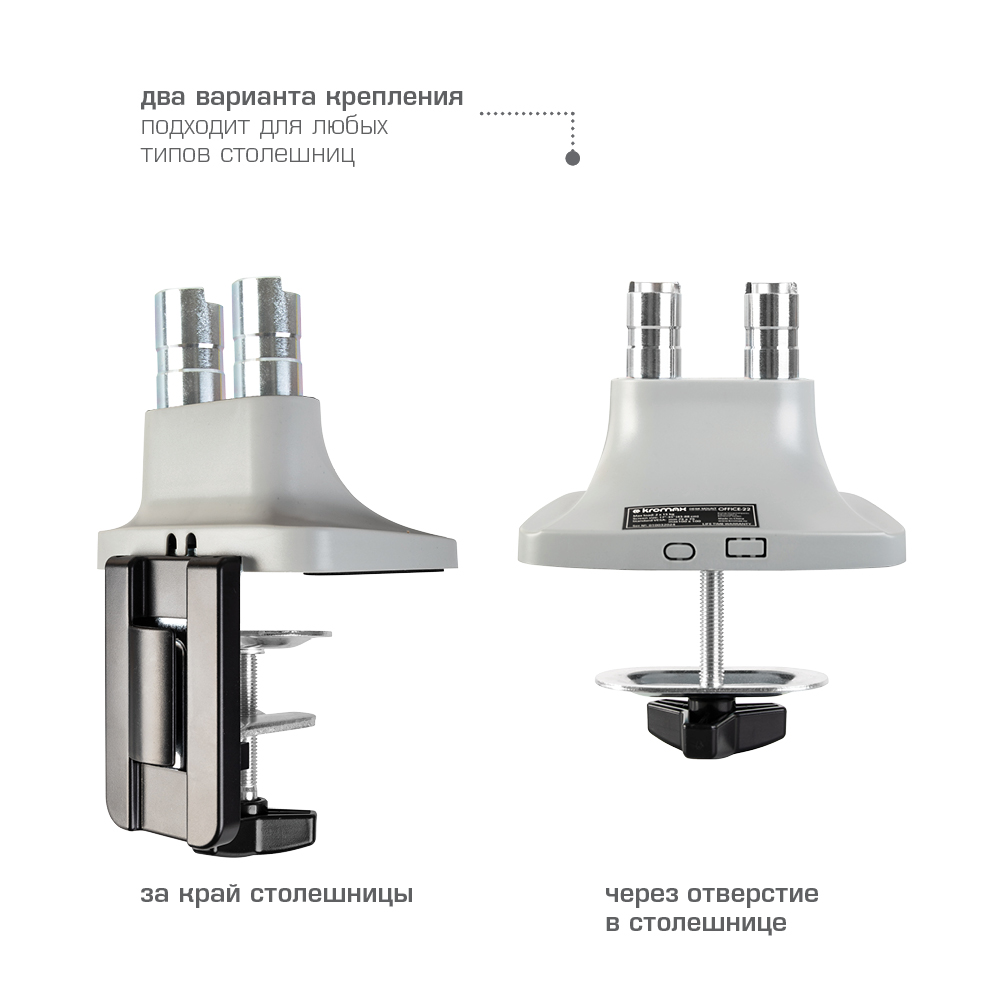 Крепёжные отверстия настольного кронштейна KROMAX OFFICE-22 SILVER изготовлены по международному стандарту VESA.