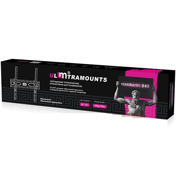Кронштейн Ultramounts UM845, это прочная стальная конструкция рекомендована для телевизоров со стандартом VESA 75x75, 100x100, 100x200, 200x100, 200x200, 300x300, 400x400 мм с размерами диагонали от 32 до 75 дюймов и весом не превышающих 45 кг. Крепление UM845, позволяет повесить телевизор выставив удобный для просмотра угол наклона. Простой и эргономичный дизайн, высокое качество, аккуратный внешний вид.