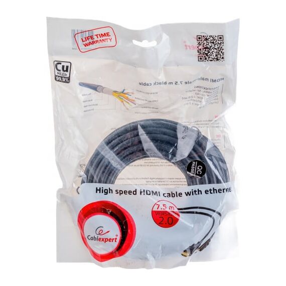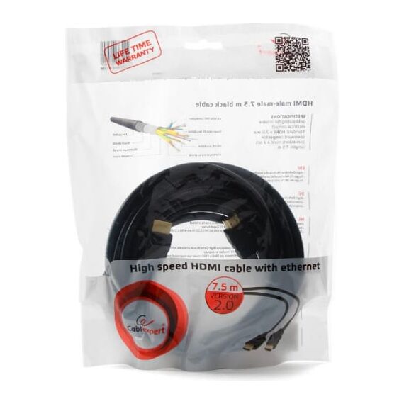 Технические характеристики Cablexpert HDMI v2.0, 19M/19M, 7.5м, черный, позолоченные разъемы, экран CC-HDMI4-7.5M