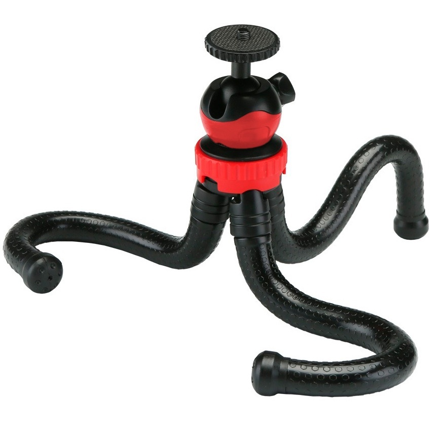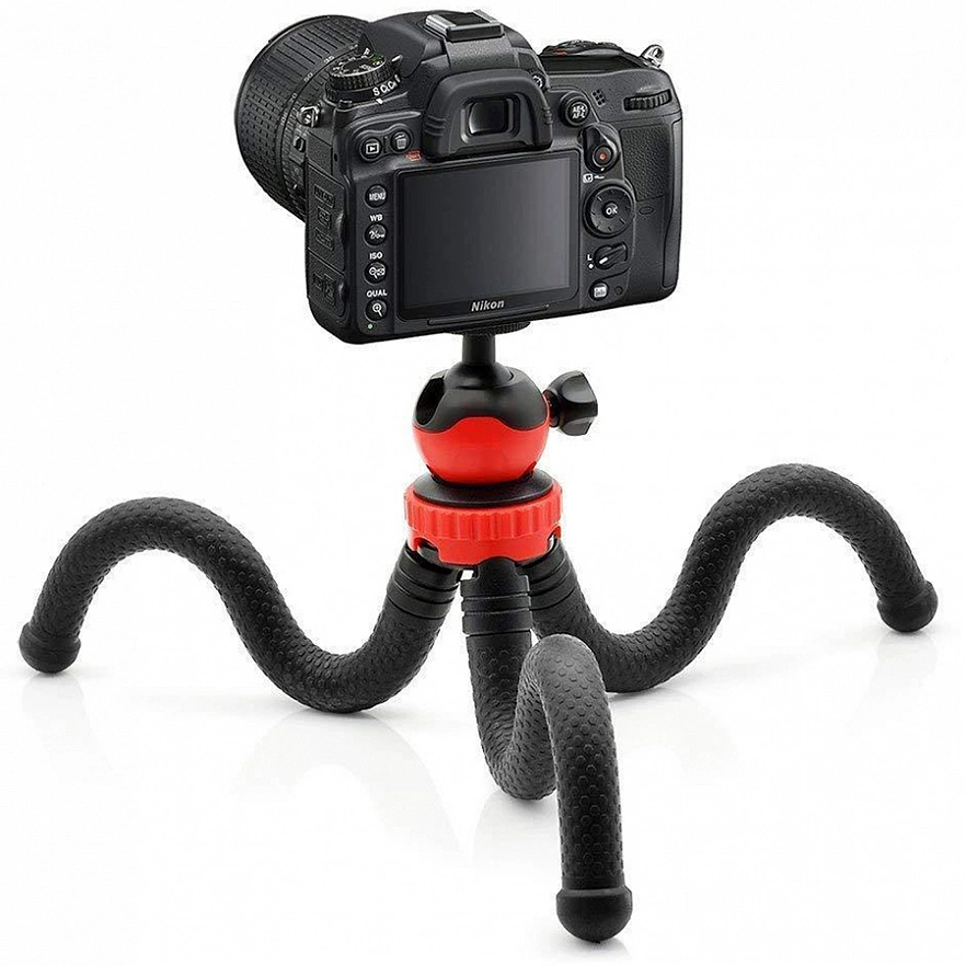 Данный штатив отличается удобной и оригинальной конструкцией и многофункциональностью. Благодаря гибким ножкам, способным сгибаться в любое положение, вы легко сможете закрепить его где угодно! Он сделан из легких и одновременно прочных материалов и обладает небольшим весом, равным всего 370 граммам. При этом трипод способен выдержать вес до 1 килограмма, а значит на нем можно установить почти любую зеркальную камеру с объективом.