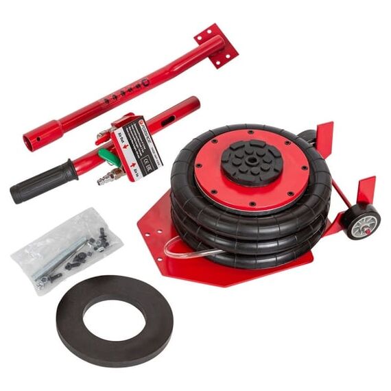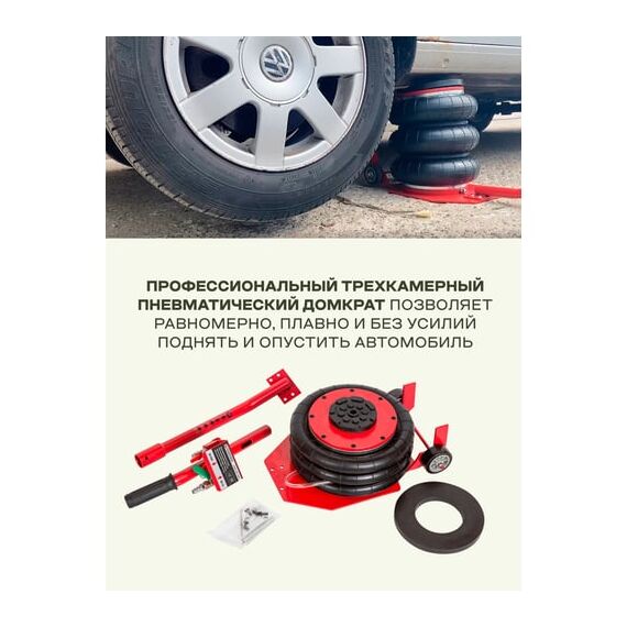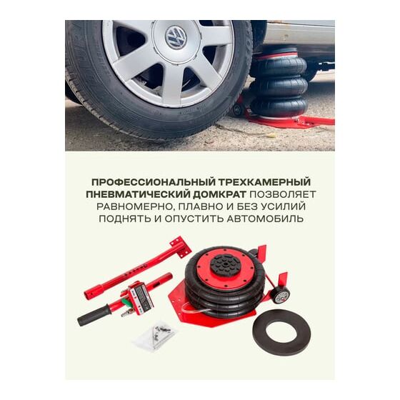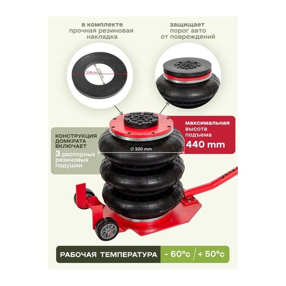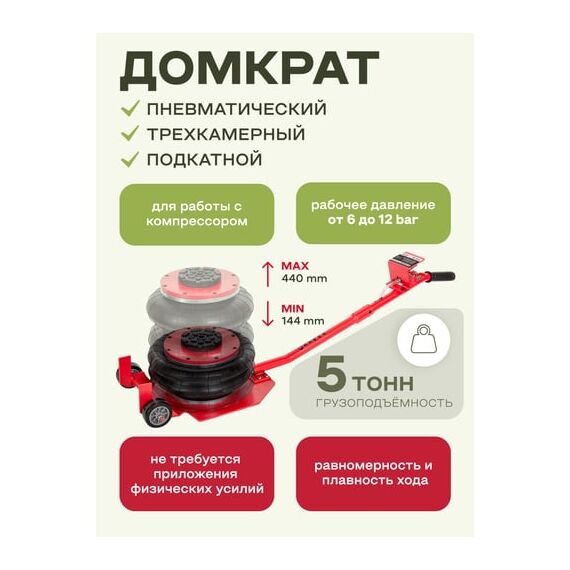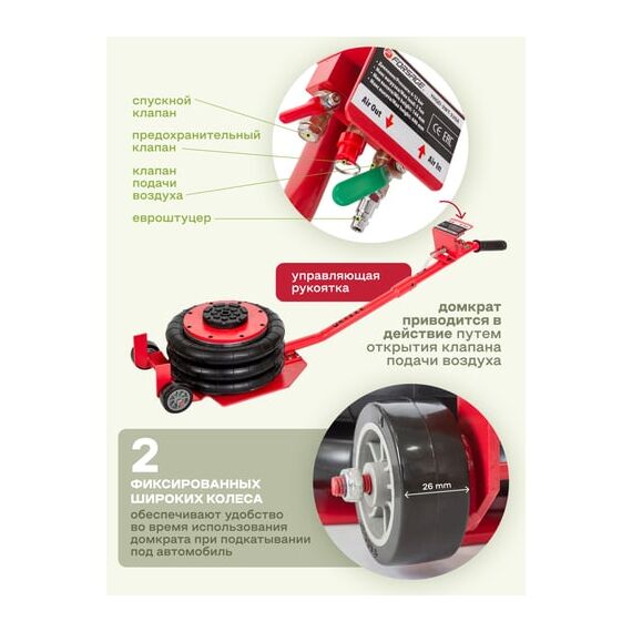 Продуманность конструкции. Подкатной домкрат имеет грузоподъемность 5 тонн и рассчитан на подключение к компрессору, подающему сжатый воздух под давлением от 6 до 12 бар. Устройство приводится в действие путем открытия крана подачи, расположенного на конце управляющей рукоятки. Конструкция данной модели включает три распорные резиновые подушки диаметром 270 мм.