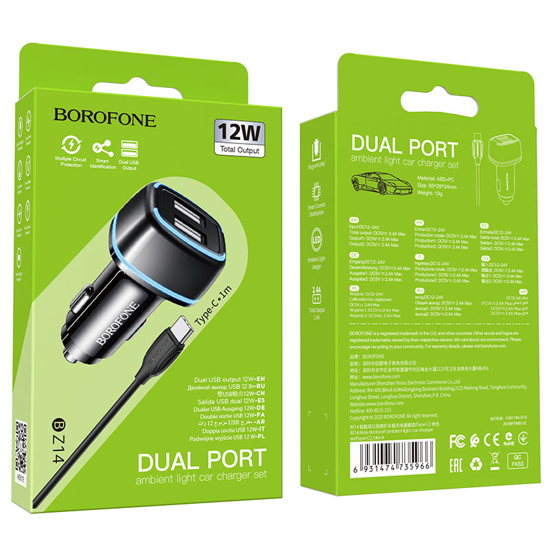 АЗУ Borofone BZ14 Max ambient light 5V/2,4A 2USB + Type-C cable, black