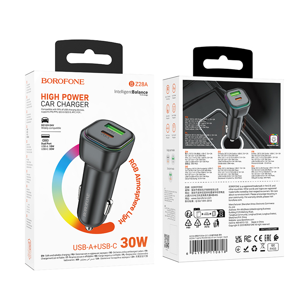 АЗУ BOROFONE BZ28A Trophie PD30W+QC3.0 car charger черный