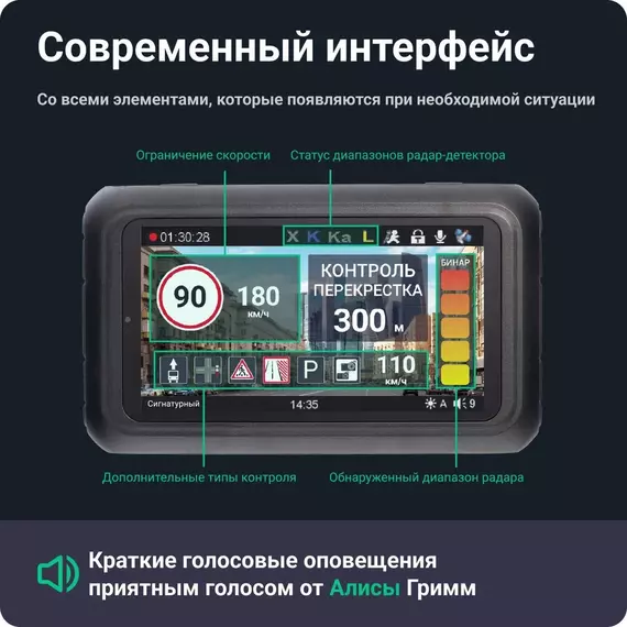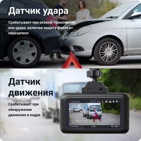 Особенности видеорегистратора: Голосовые подсказки, Запись по детектору движения, Запись события в отдельный файл, Режим фотосъемки