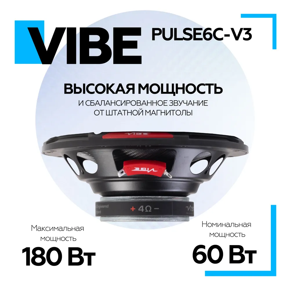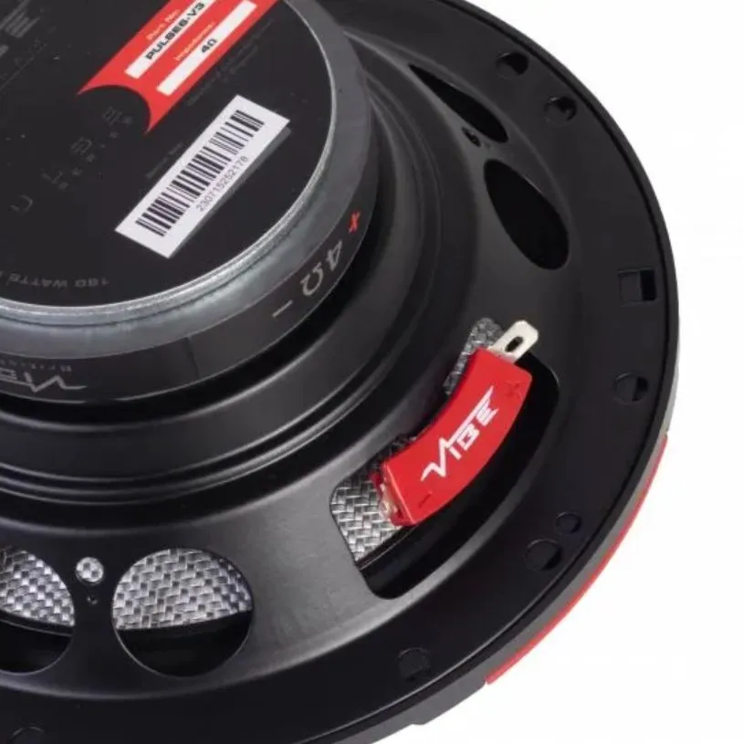 2-х полосная коаксиальная акустическая система VIBE PULSE6C-V3 – универсальная коаксиальная акустика подходящая практически в любой автомобиль, идеально выполняет роль замены штатной акустики. АКУСТИЧЕСКАЯ СИСТЕМА ВАЙБ – универсальная коаксиальная акустика подходящая практически в любой автомобиль, идеально выполняет роль замены штатной акустики. Нч-диффузор инжекционного литья с гальваническим покрытием “Electroplating” с износостойким бутилкаучуковым подвесом. Твитер с расширенным диапазоном воспроизведения высоких частот.